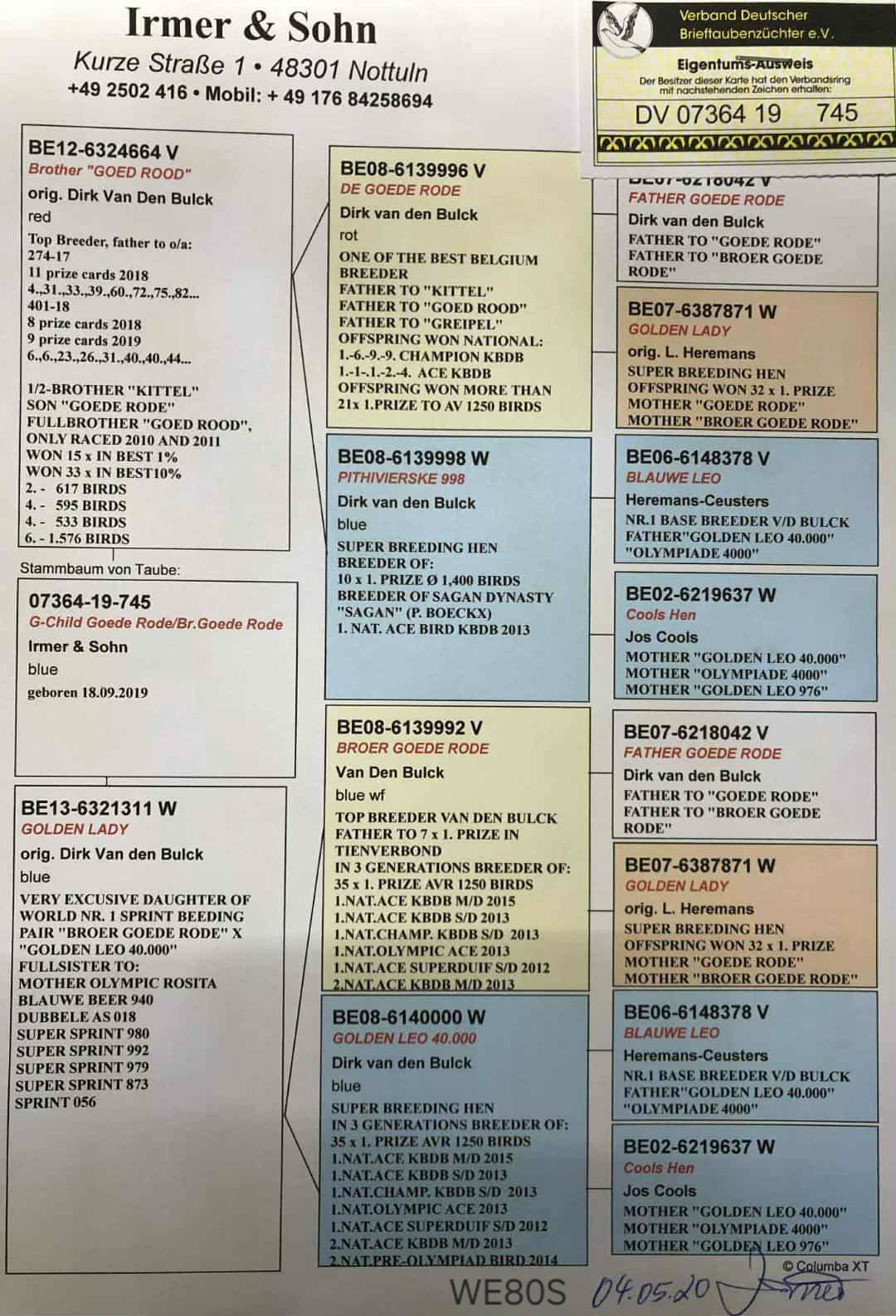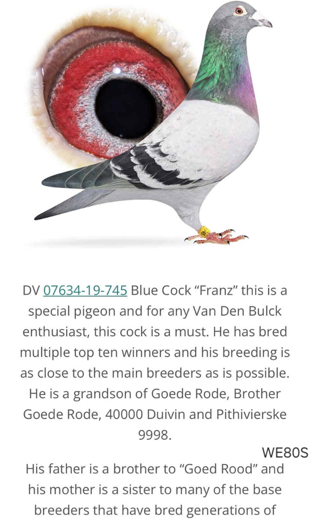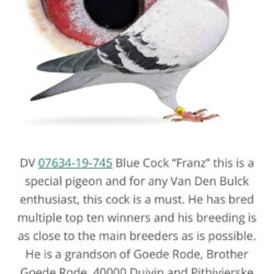 The combination of Van Den Bulck x Stefan Lambrecht is winning across Europe — and this pigeon is already proving it with a strong Grand Final result. Perfect addition for any serious fancier looking to strengthen their OLR or sprint/mid-distance breeding loft with verified, performance-tested bloodlines
