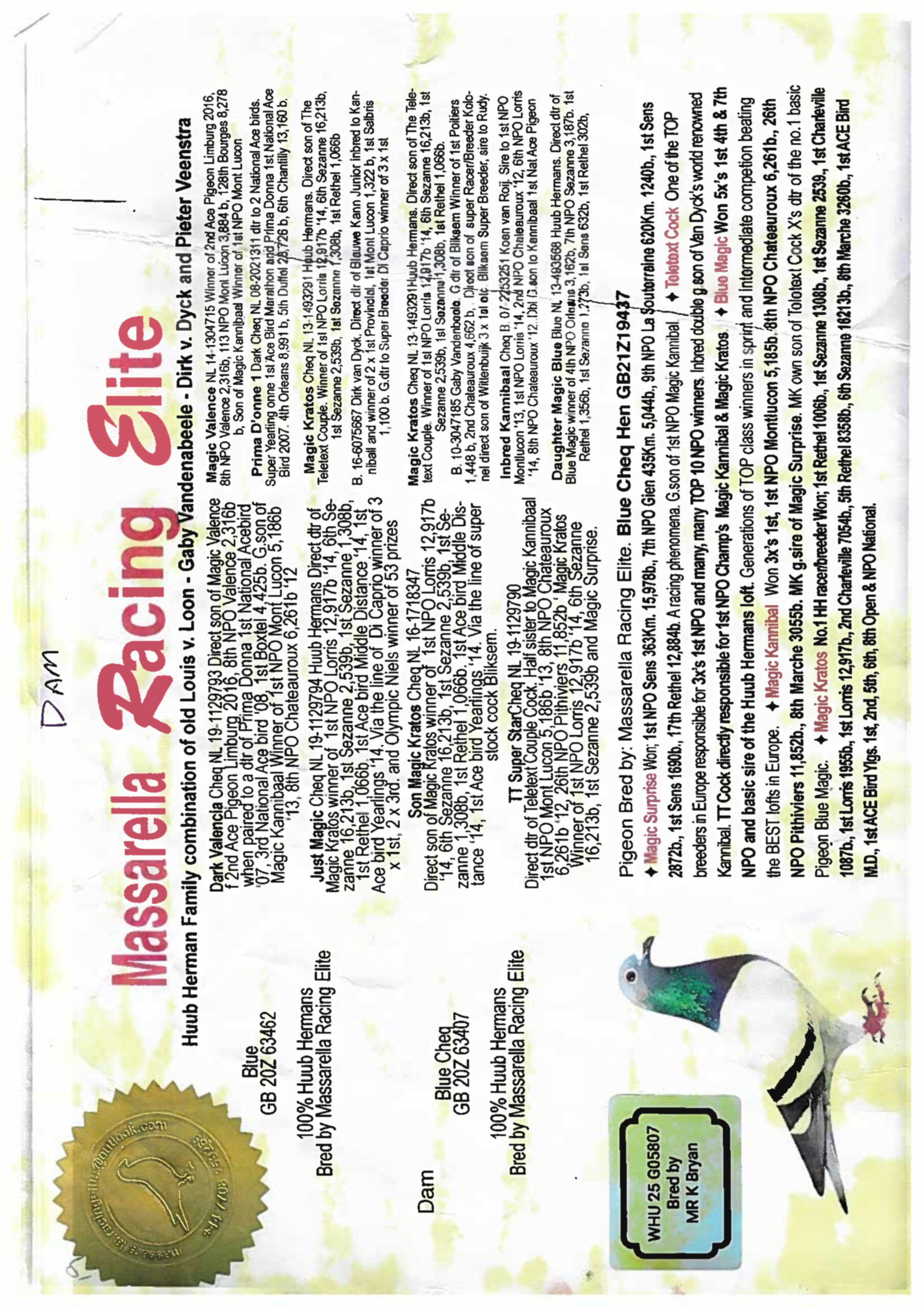 Bred by Massarella Racing Elite, a direct son of “Magic Surprise”, one of the most influential breeders in the Huub Hermans loft. This line has produced