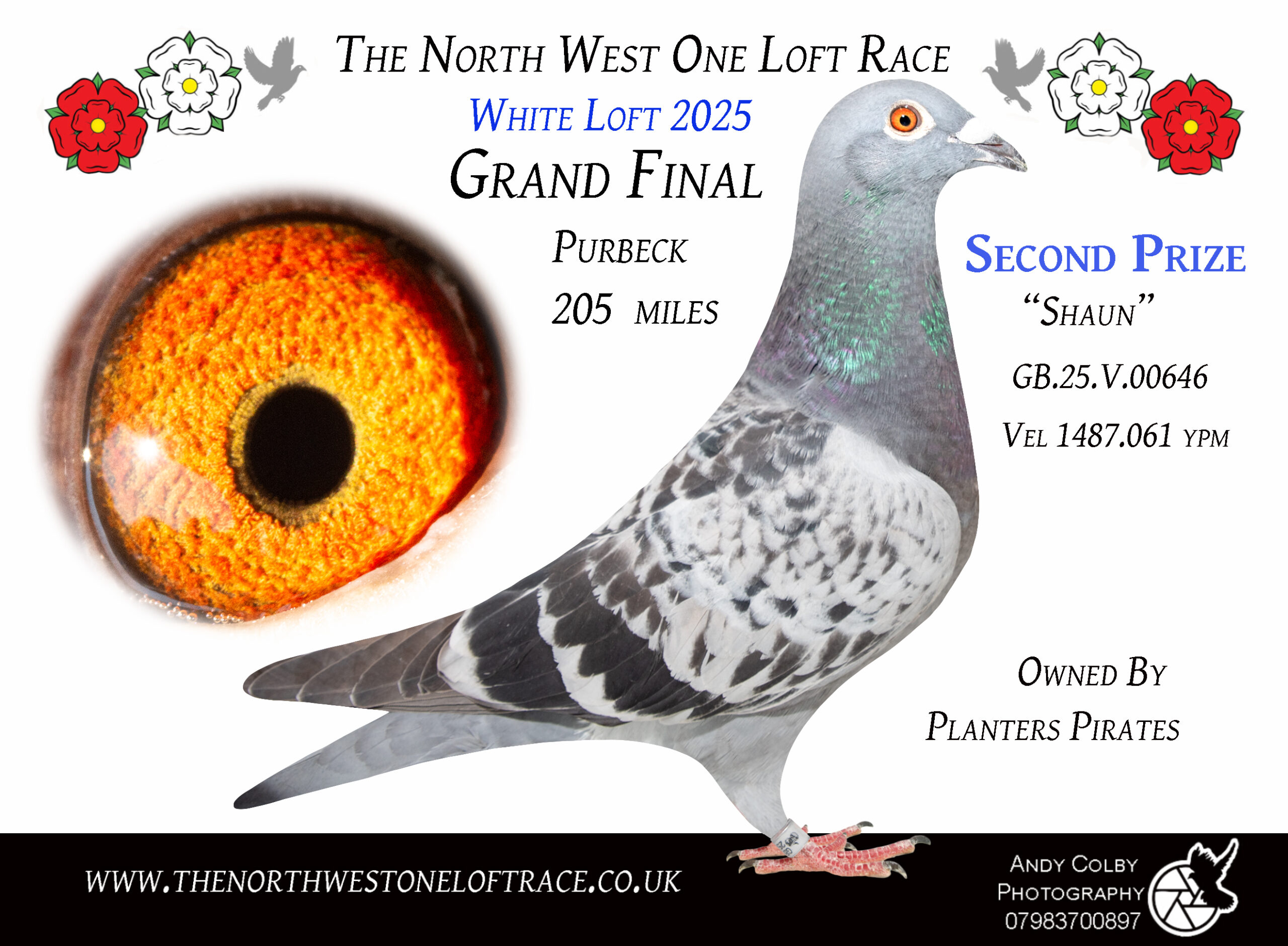GB 25 V00646 Cheq Cock “Planters Shaun” winner of 2nd Open Final Race (White Loft) and 54th HDS 5, 36th Semi-Final. Entered and bred by Planters Pirates he is bred from Best Kittel and Van Den Bulck lines.