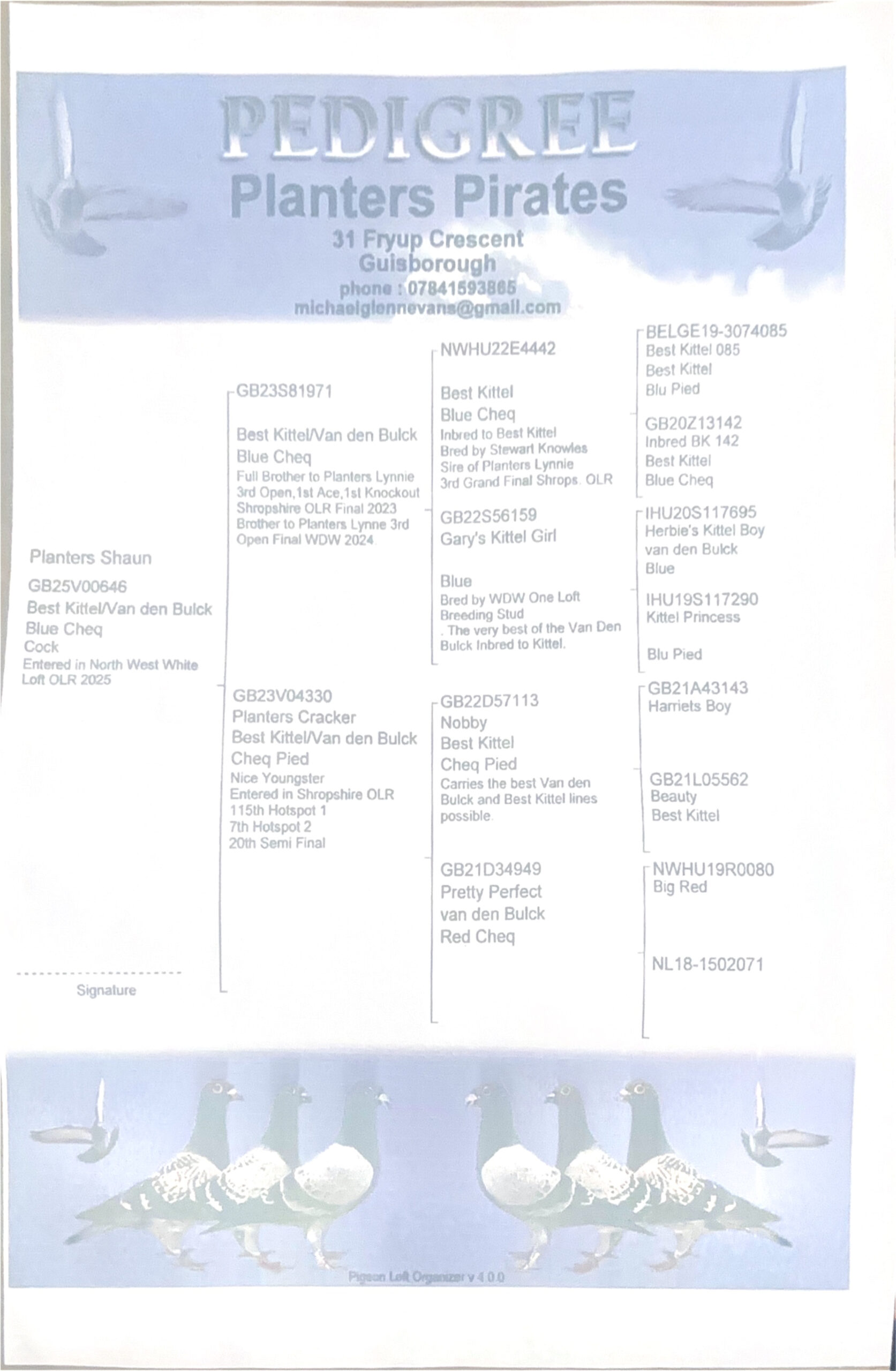 GB 23 S81971 he is a full brother to Planters Lynnie, the winner of 3rd Open, 1st Ace, 1st Knockout Shropshire OLR Final 2023. Als brother to Planters Lynne, winner of 3rd Open Final WDW 2024. Planters Lynnie is from an inbred Best Kittel cock from Stewart Knowles X a beautiful Van Den Bulck hen from the lines of Herbie’s Kittel Boy and Kittel Princess.