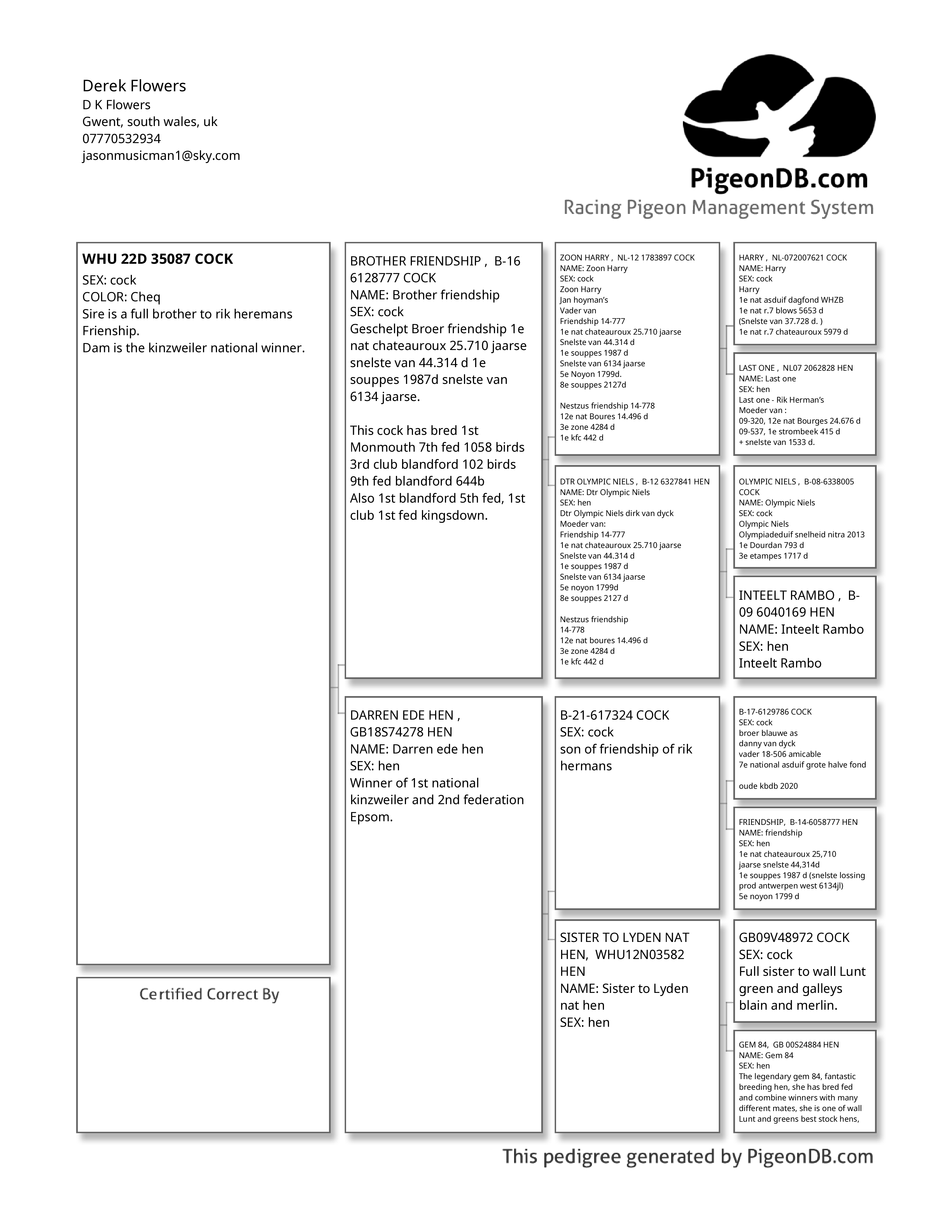 SIRE Belge 16-6128777 “Brother Friendship” he is a full brother to the super “Friendship” of Rik Hermans that won 1st National Chateauroux 25,710 birds and was the fastest from the entire liberation of 44,314b, Friendship also won 1st Souppes 1,987b and was the fastest from 6,134b. ‘777’ has bred 7th fed from Monmouth 1.058b, 3rd from Blandford against 102b, 9th Fed Blandford 644b and 1st club 5th Fed Blandford, 1st Club, 1st Fed Kingsdown. His father is a son of Harry of Jan Hooymans and his mother is a daughter of ‘Olympic Niels’ of Dirk Van Dyck.