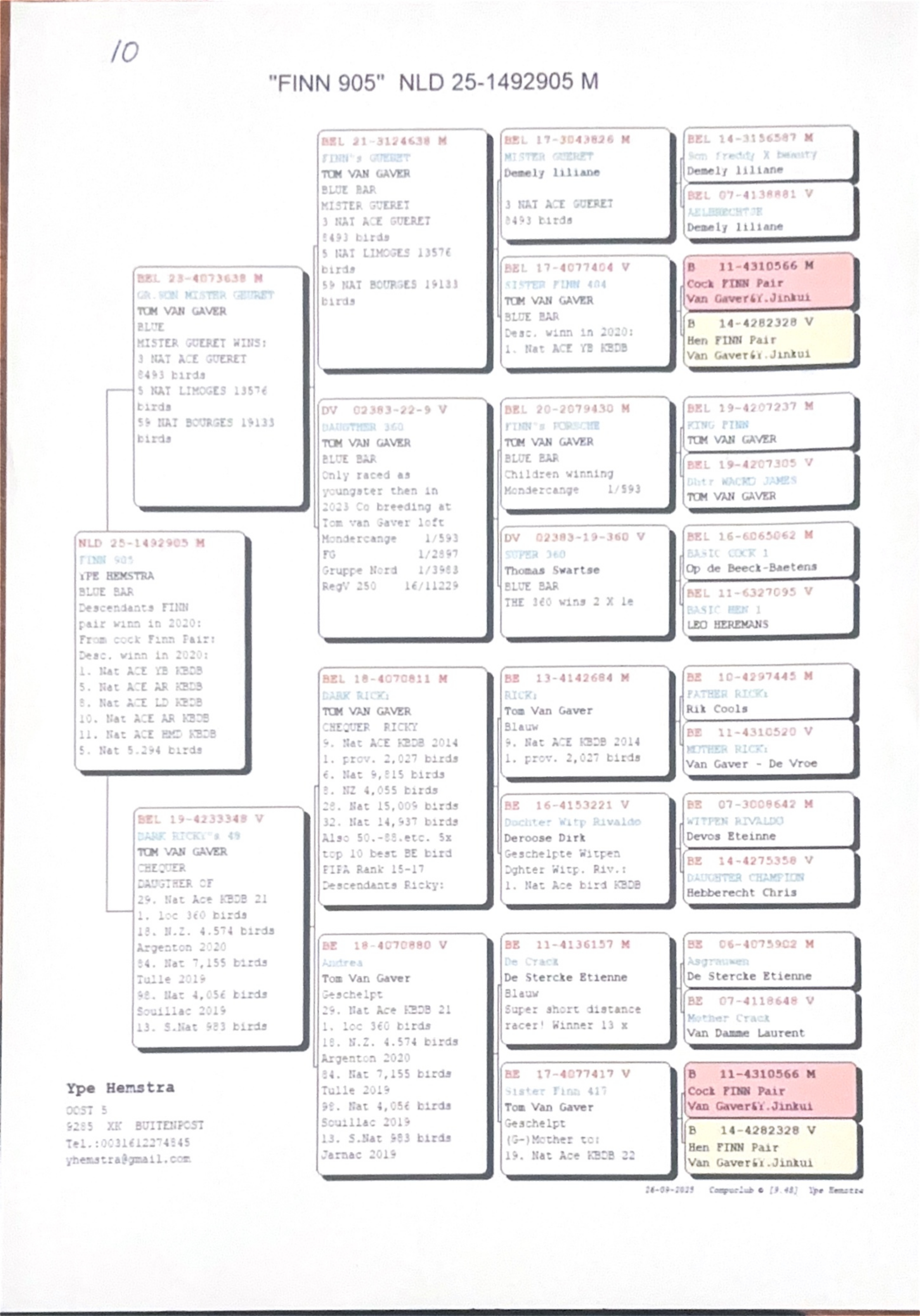 Belge 23-4073638 he is a son of Finn’s Gueret, he was bred in co-breeding with Tom Van Gaver, his father is “Finn’s Gueret” the winner of 3rd National Gueret 8,493b, 5th National Limoges 13,576b and 59th National Bourges 19,133b.