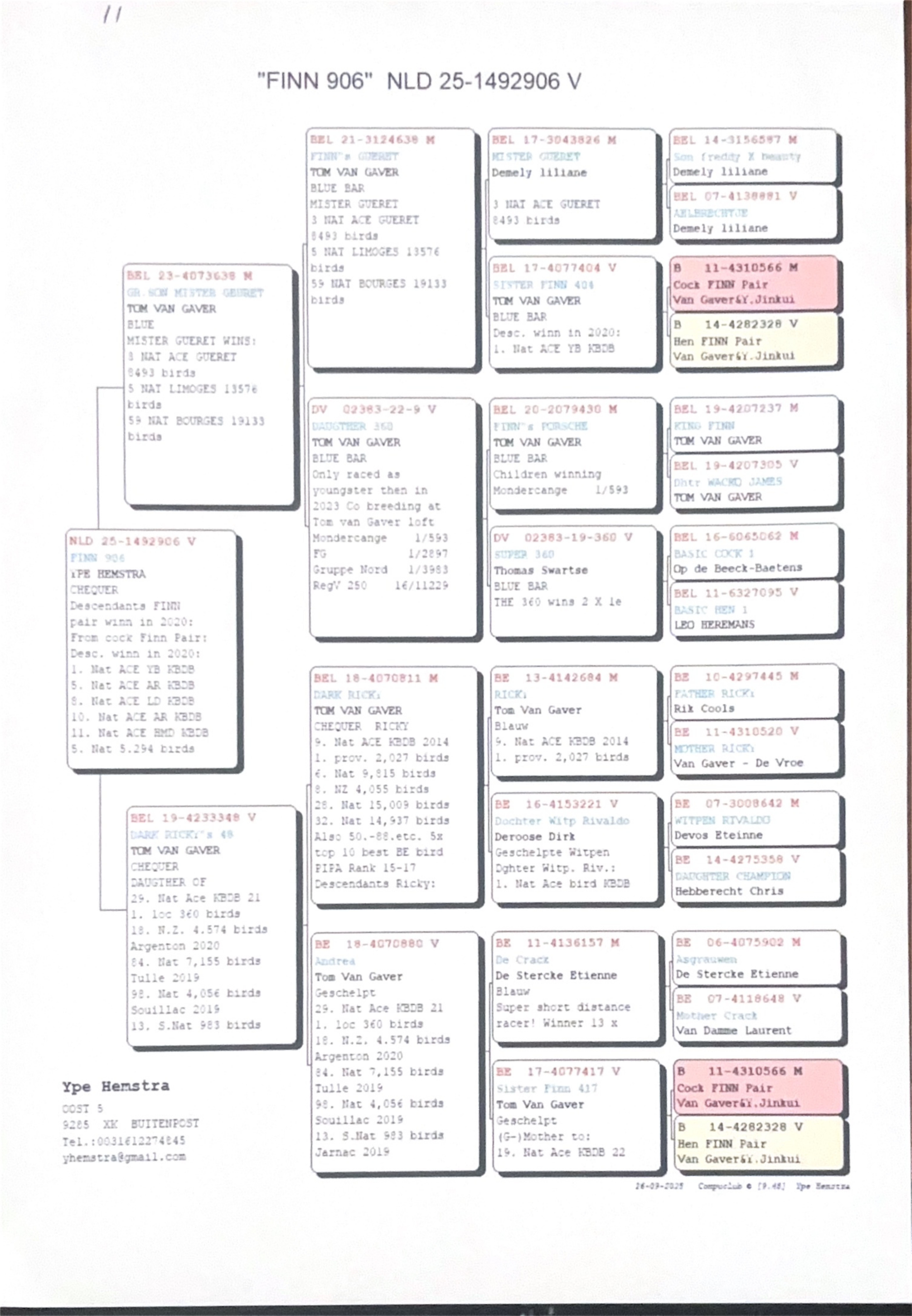 Her father is Dark Ricky, bred from Ricky and her mother is Andrea, the 29th National Ace Pigeon KBDB 2021, 18th section National Argenton 4,574b, 84th National Tulle 4,056b and 13th S-National Jarnac 983b. Andrea is a daughter from De Crack X a sister to Finn.