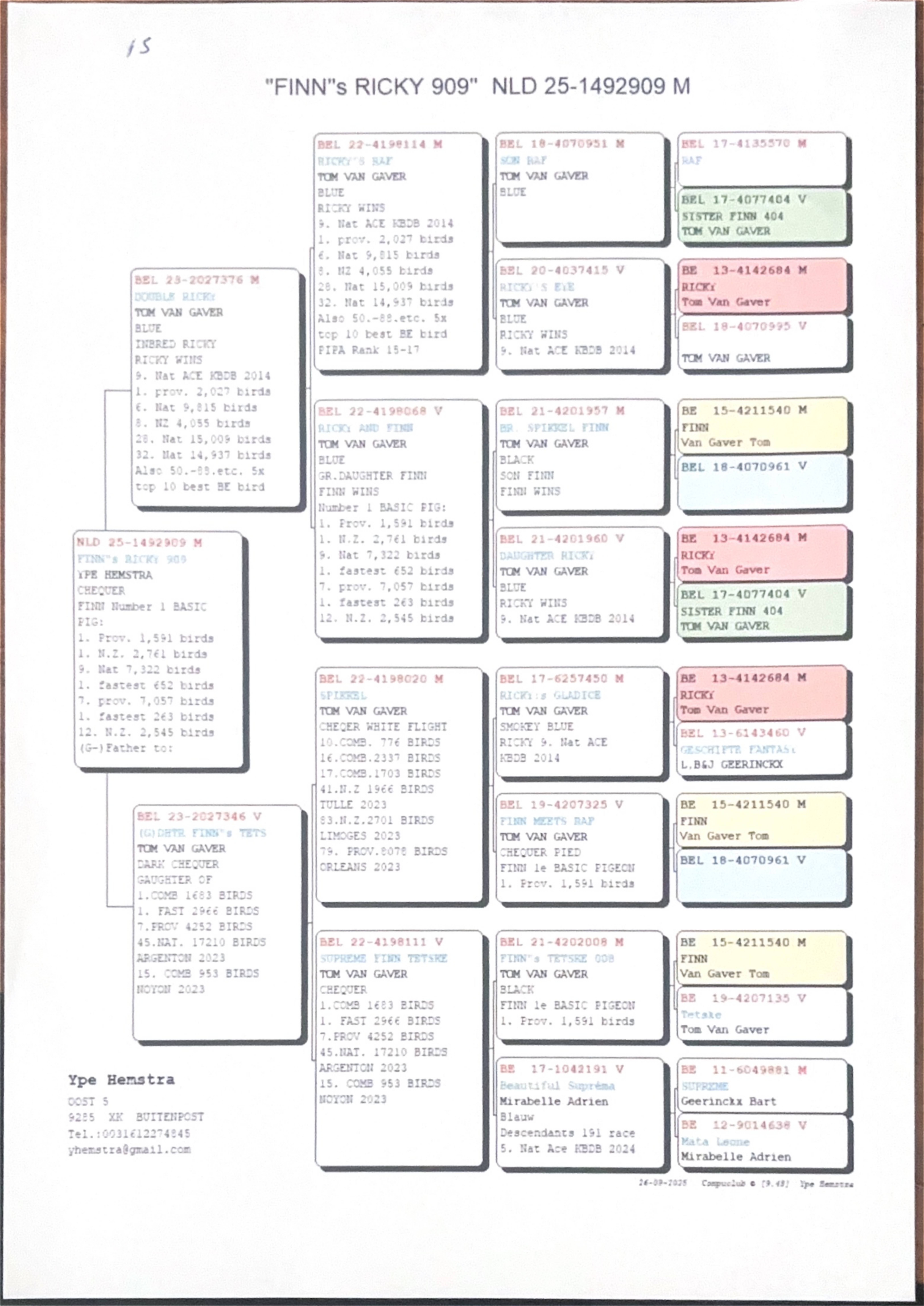 Ricky won 9th National Ace KBDB 2014, 6th National 9,815b, 8th Nat/Zone 4,055b, 28th National 15,009b, 32nd National 14,937b and he was 5 X top 10 best Belgium pigeon.