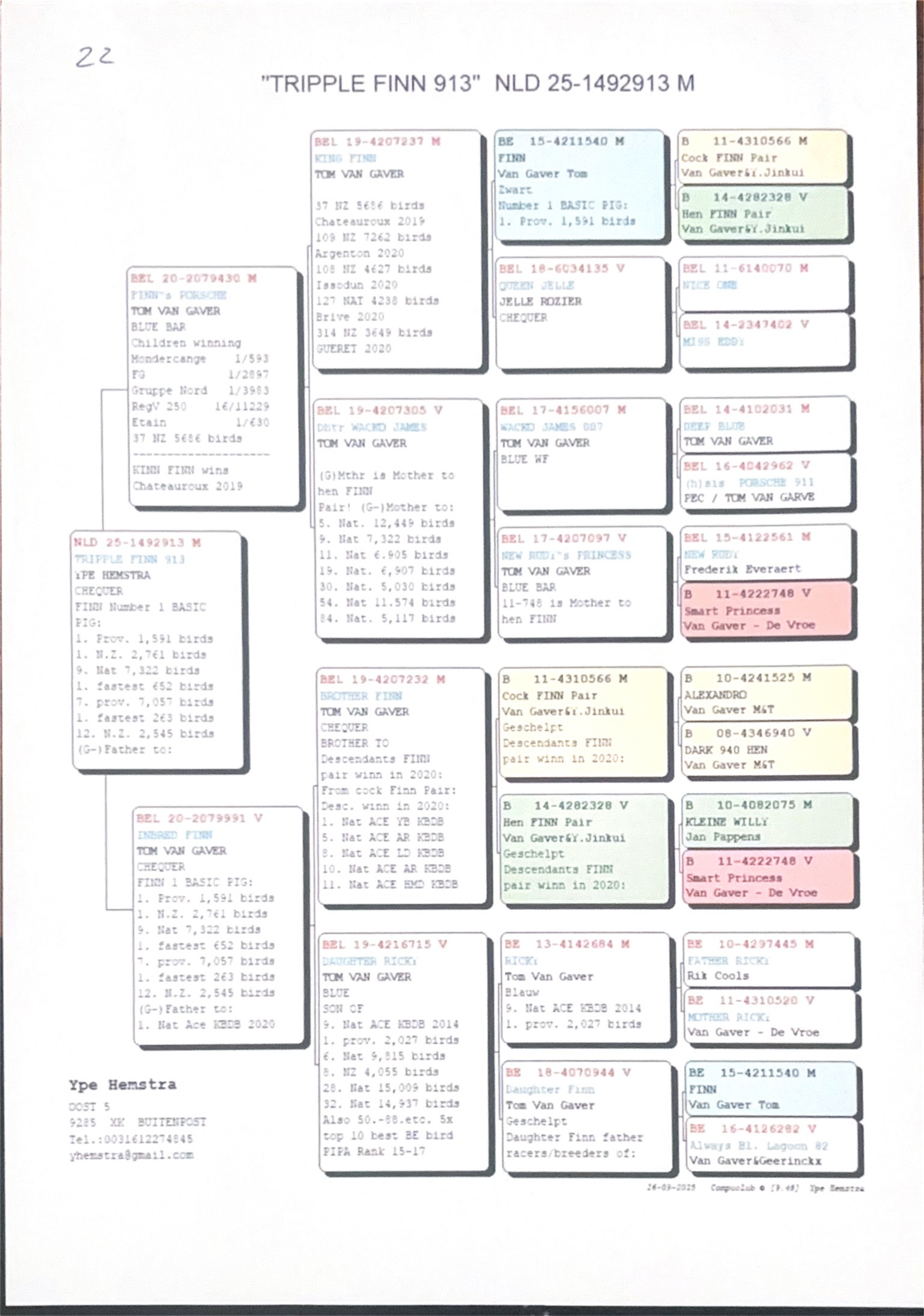 Belge 20-2079430 “Finn’s Porsche” he is a top breeder and his children are winning major prizes such as 1st Mondercange 593b, 1st FG 2,897b, 1st Gruppe Nord 3,983b, 16th Regional 11,229b, 1st Etain 630b, 37th Nat/Zone 5,686b. he is a son from King Finn X Dtr Wacko James. King Finn is a direct son of the No1 cock Finn X Queen Jelle.