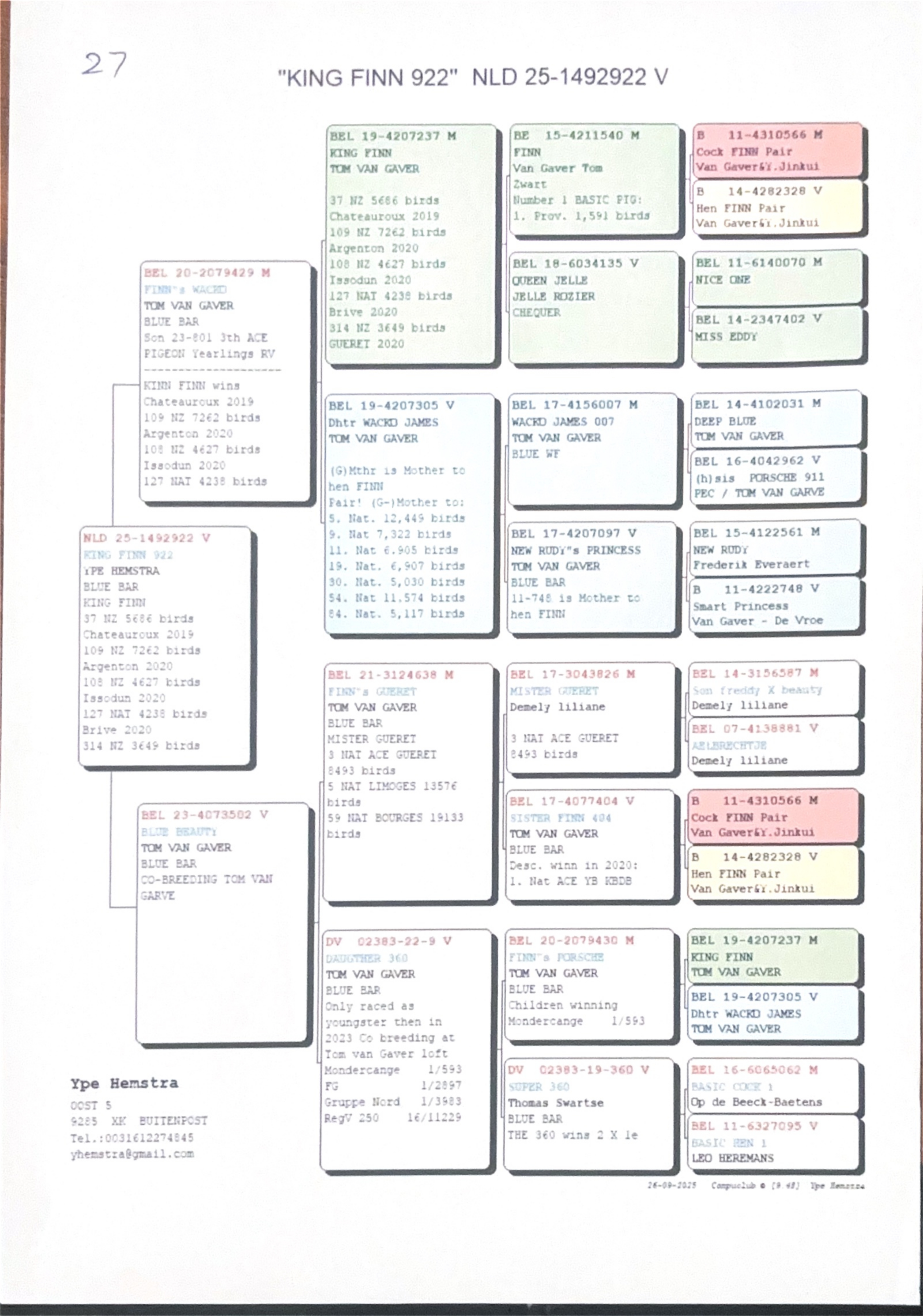 Belge 20-2079429 “Finn’s Wacko” he is a direct son of King Finn and his mother is a daughter from Wacko James 007. King Finn won 37th Nat/Zone Chateauroux 5,686b, 109th Nat/Zone Argenton 7,262b, 108th Issoudun 4,627b, 127th National Brive 4,238b and 314th Nat/Zone Gueret 3,649b He is a son from the No1 cock Finn X Queen Jelle.